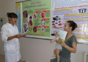 Дамбы дәрігерлік амбулаториясында Балалық шақтың ауруларын ықпалдастыра емдеудің стандарттарын енгізу (БШАЫЕ) бағдарламасы бойынша педиатр Молбай Сани..